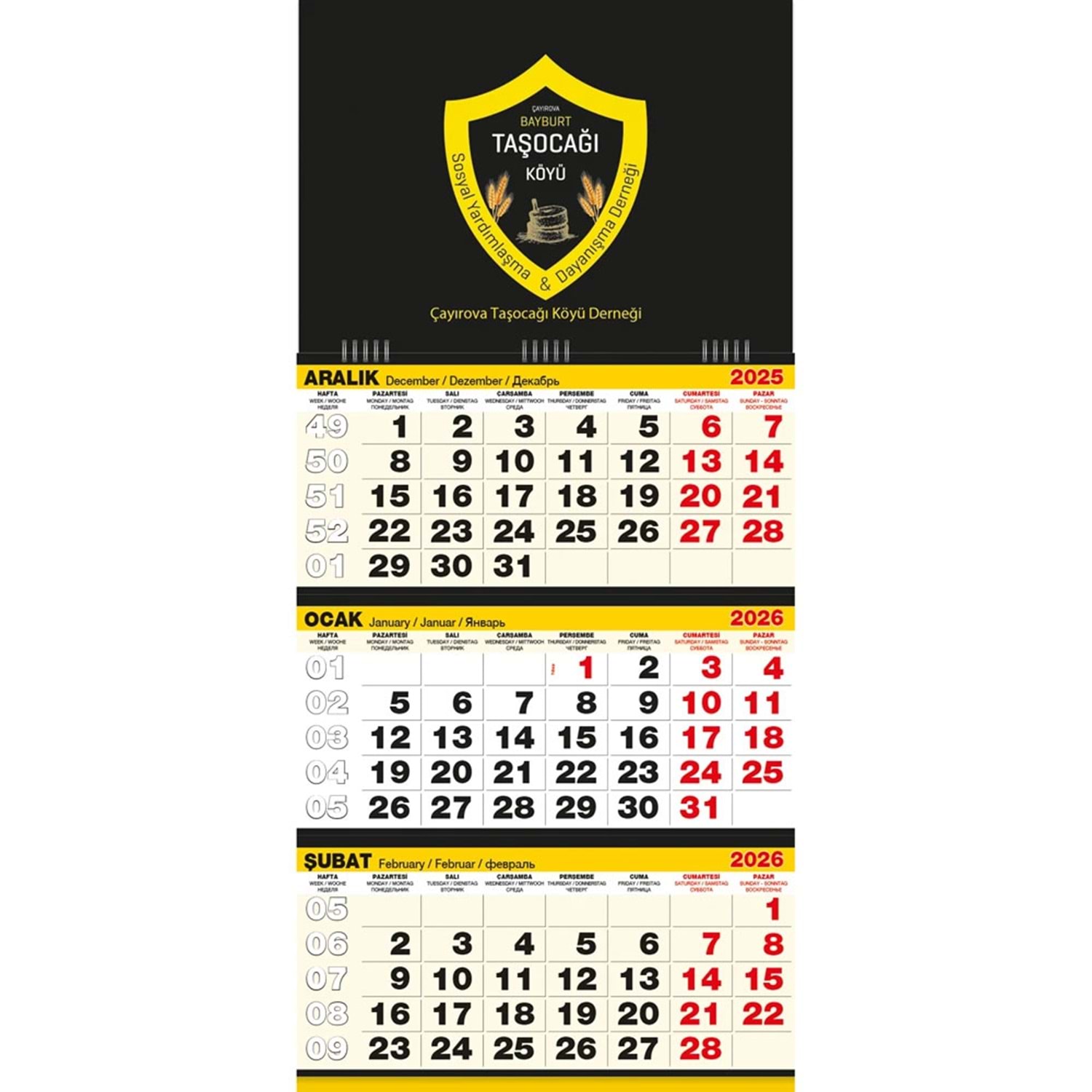 * Tek Parça Spiralli * Takvim Ebat: 33 x 73 cm * Ayna: 350gr. A.Bristol * Alt Karton: 350gr. A.Bristol * Reklam Alanı: 33 x 23 cm * Blok Ebat: 33 x 48 cm * Yaprak Kağıdı: 80gr. 1.Hamur